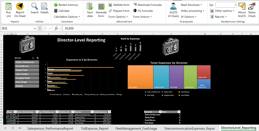 ALLOS takes the opposite approach. It is an Excel-native Business Intelligence and Analytics platform that turns Excel itself into the BI environment. Analytics, reporting, and document generation are built directly in Excel, connected to enterprise data sources and enhanced with AI.